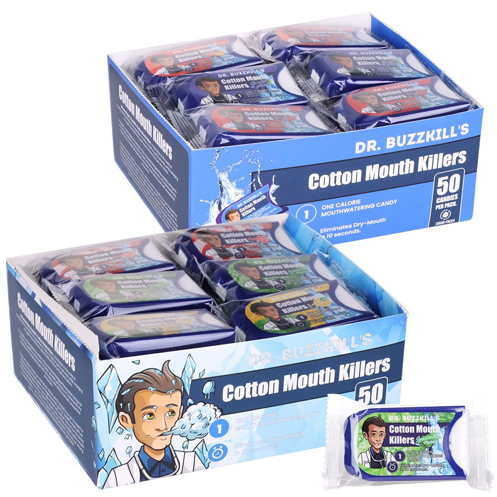 Dr. Buzzkill's CottonMouth Killers Candy delivers fast, refreshing relief from dry mouth. Packaged in a convenient 24-pack display, each display contains 50 pieces per pack and features a single-piece dispenser for quick, hygienic dosing. Made for on-the-go use, this product is ideal for anyone who needs rapid moisture restoration while staying discreet.